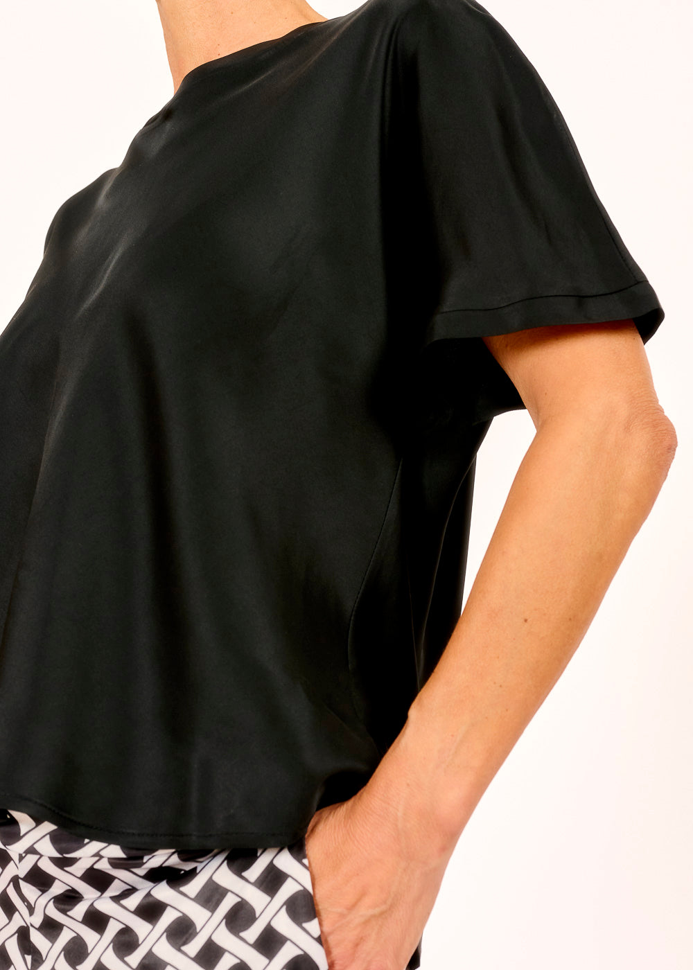 Dieses Satin Shirt in klassischem Schwarz vereint lässigen Chic mit eleganter Ausstrahlung. Der fließende Stoff verleiht dem Shirt eine edle Note und sorgt für ein angenehmes Tragegefühl. Ob zu Jeans oder zum schicken Rock – dieses Oberteil passt sich jedem Look stilvoll an.
