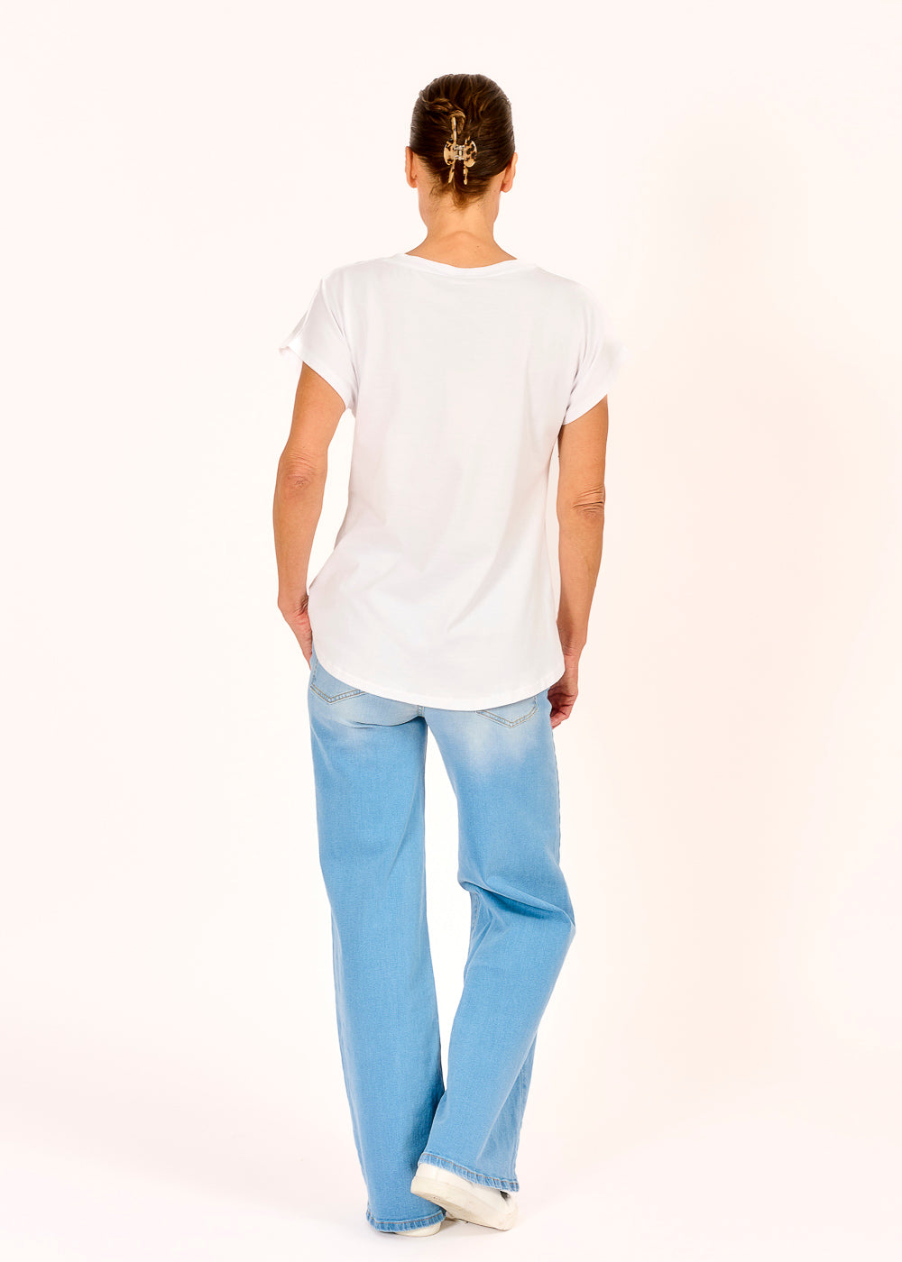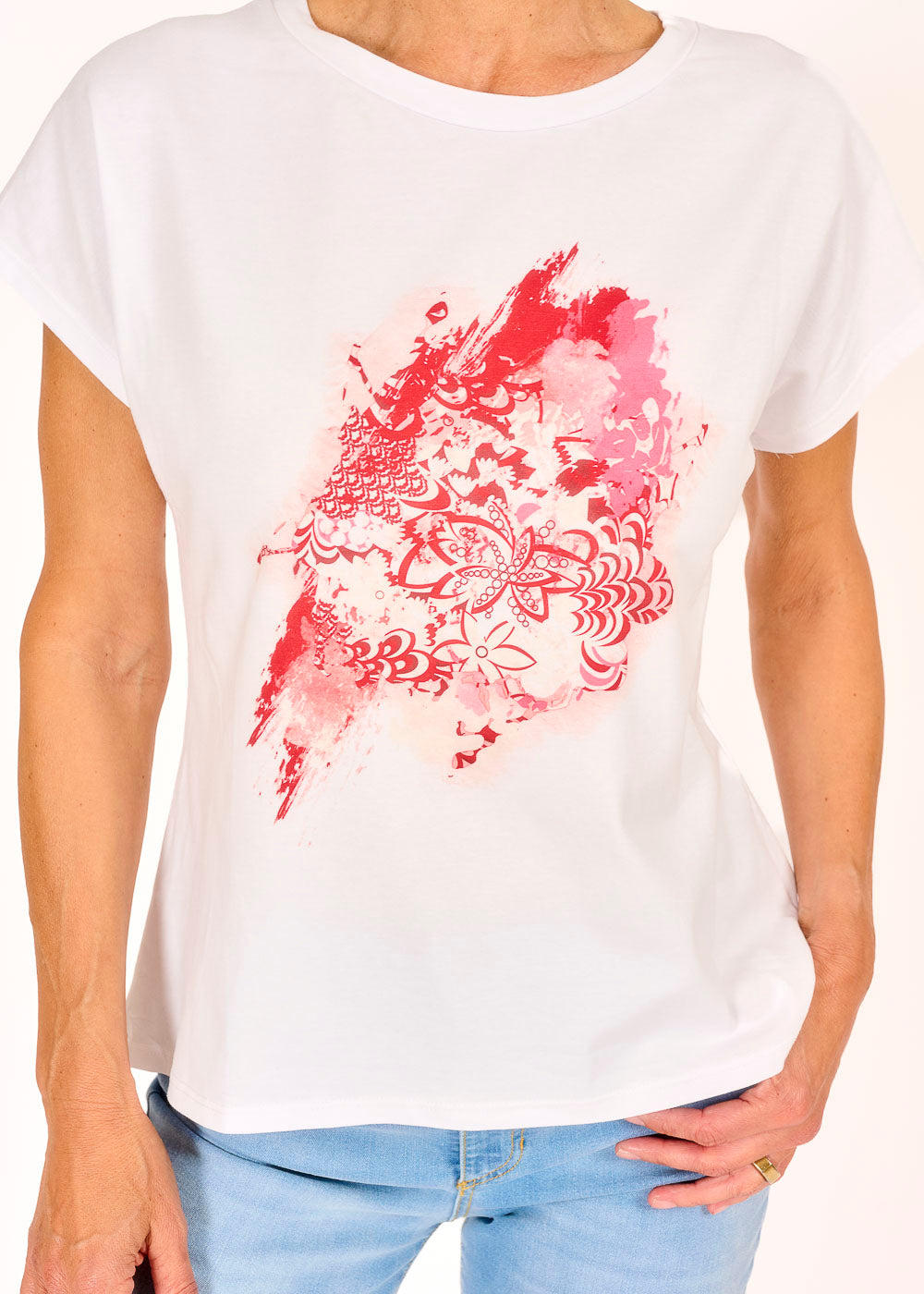 Dieses weiße Shirt mit abstraktem Druck in kräftigem Rot verleiht jedem Outfit einen modernen, künstlerischen Touch. Der legere Schnitt macht es zum perfekten Begleiter für einen lässigen und gleichzeitig stylischen Look.