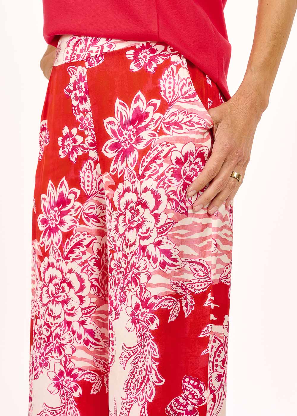 Diese bedruckte Hose überzeugt mit einem gewagten, modernen Muster und bringt frischen Wind in jeden Look. Der gerade Schnitt sorgt für eine schmeichelhafte Silhouette, während die kleinen Eingriffstaschen und der elastische Bund hinten für Komfort und Lässigkeit stehen. Perfekt für alle, die modisch auffallen möchten, ohne auf Bequemlichkeit zu verzichten.