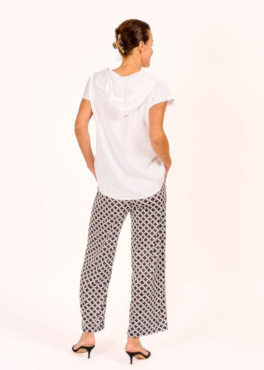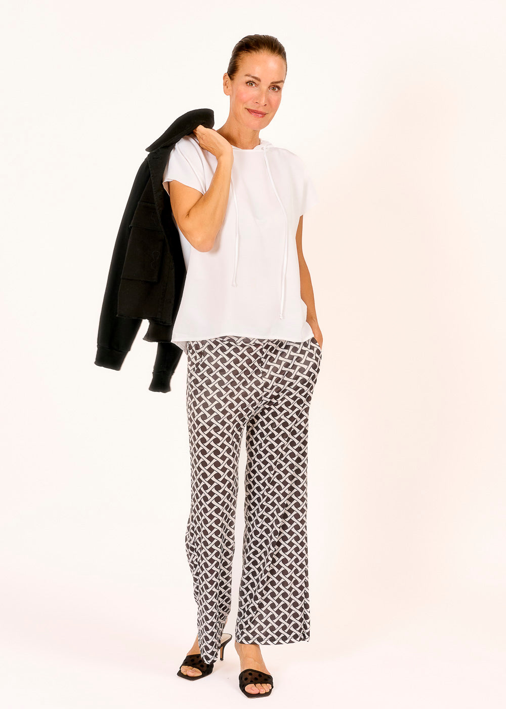 Diese locker geschnittene Kapuzetunika in der Farbe bianco-ottico vereint feminine Leichtigkeit mit sportivem Chic. Aus einem angenehmen Viskosemix gefertigt, besticht sie durch ihre Kapuze im lässigen Hoodie-Stil und die charmanten Banddetails. Die kurz geschnittenen Ärmel machen sie zum perfekten Begleiter für entspannte, stilvolle Looks.