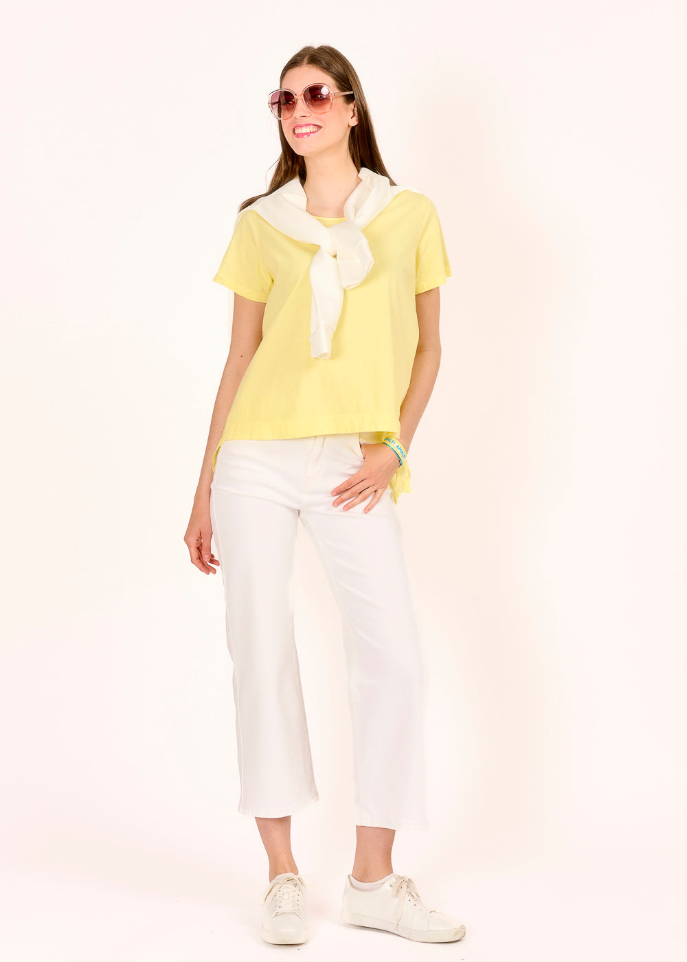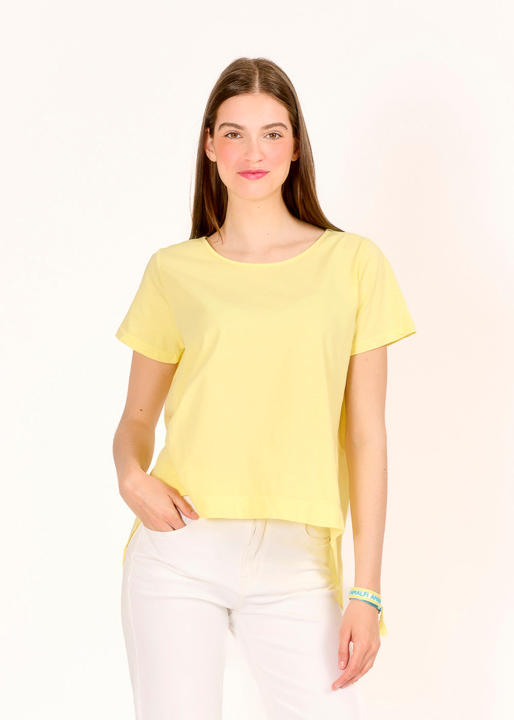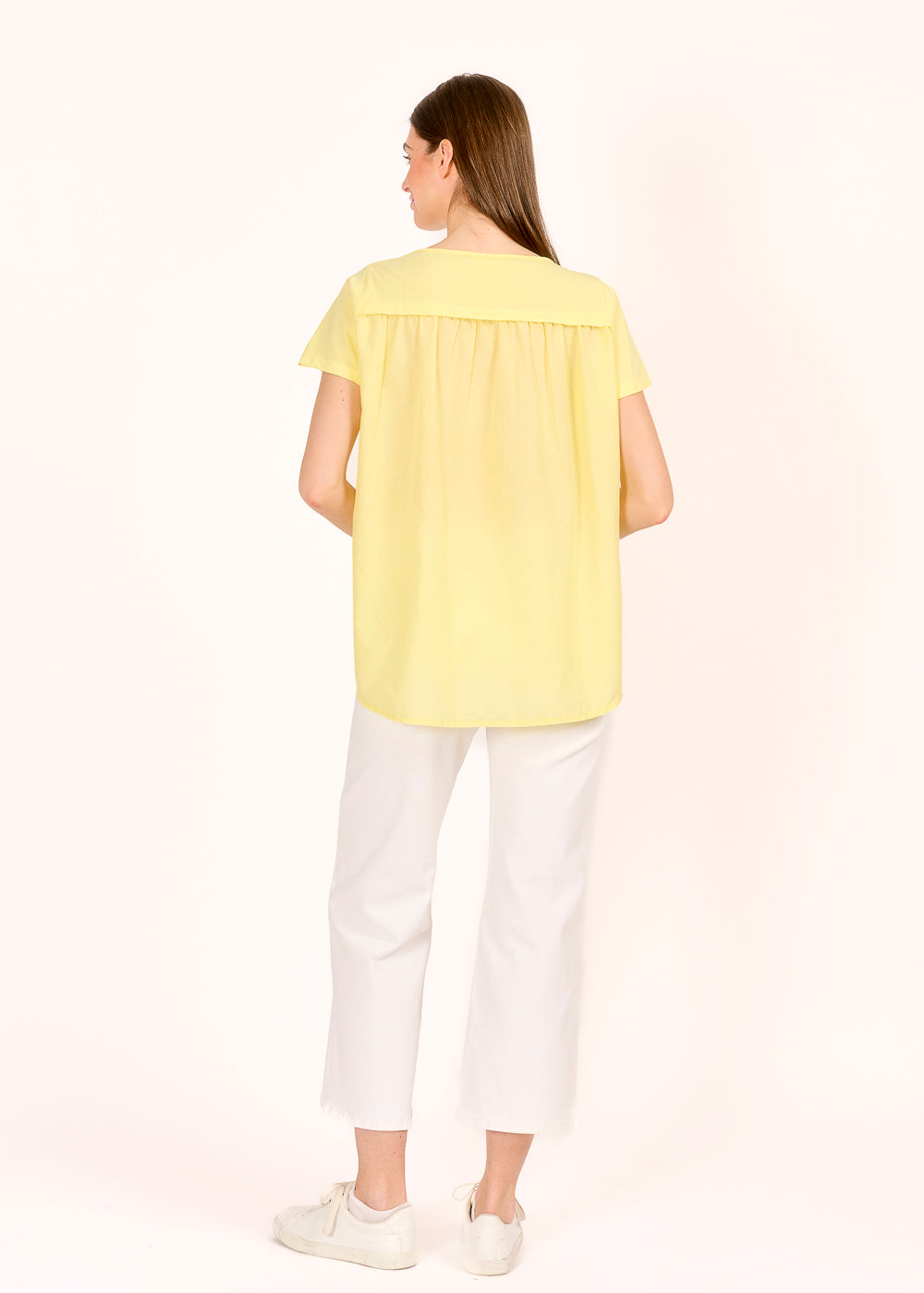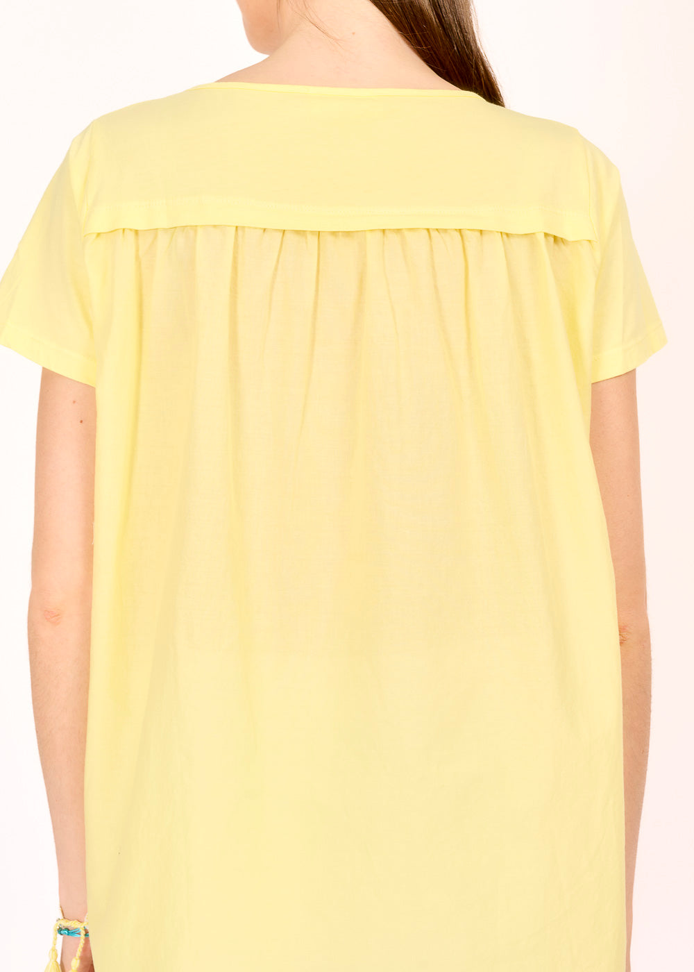 Dieses Materialmixshirt in der frischen Farbe Giallino bringt Leichtigkeit und Raffinesse in deinen Look. Die Raffung an der Rückseite sorgt für eine schmeichelnde Silhouette und setzt einen besonderen Akzent. Der hinten länger geschnittene Saum verleiht dem Shirt eine moderne Form – perfekt für stilvolle Everyday-Outfits.