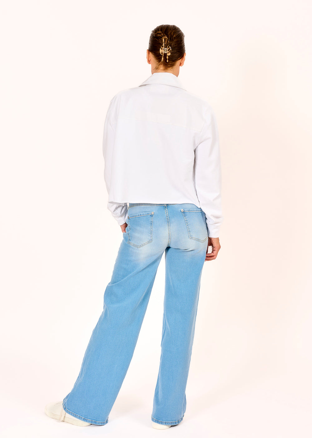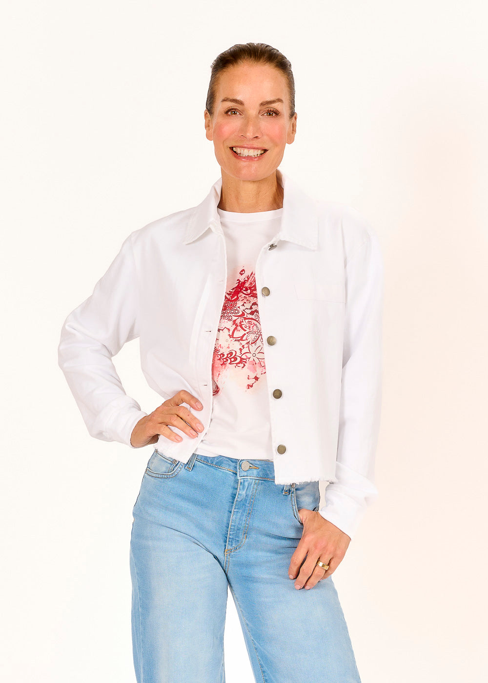 Diese elegante Kurzjacke in Weiß überzeugt mit einem modernen Materialmix, bei dem die Ärmel und die Rückseite aus weichem Sweatstoff bestehen, während die Vorderseite aus angenehmem Baumwollstoff gefertigt ist. Der Mix aus beiden Stoffen sorgt für ein gemütliches Tragegefühl und eine stilvolle Optik. Perfekt für den Alltag oder als modisches Teil für den Übergang – ein vielseitiger Begleiter für jede Gelegenheit.