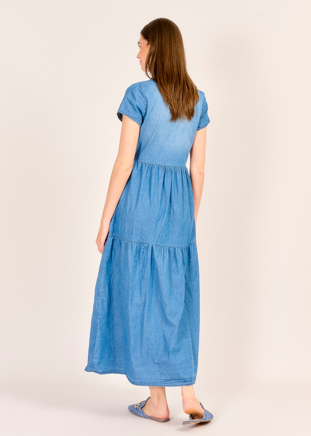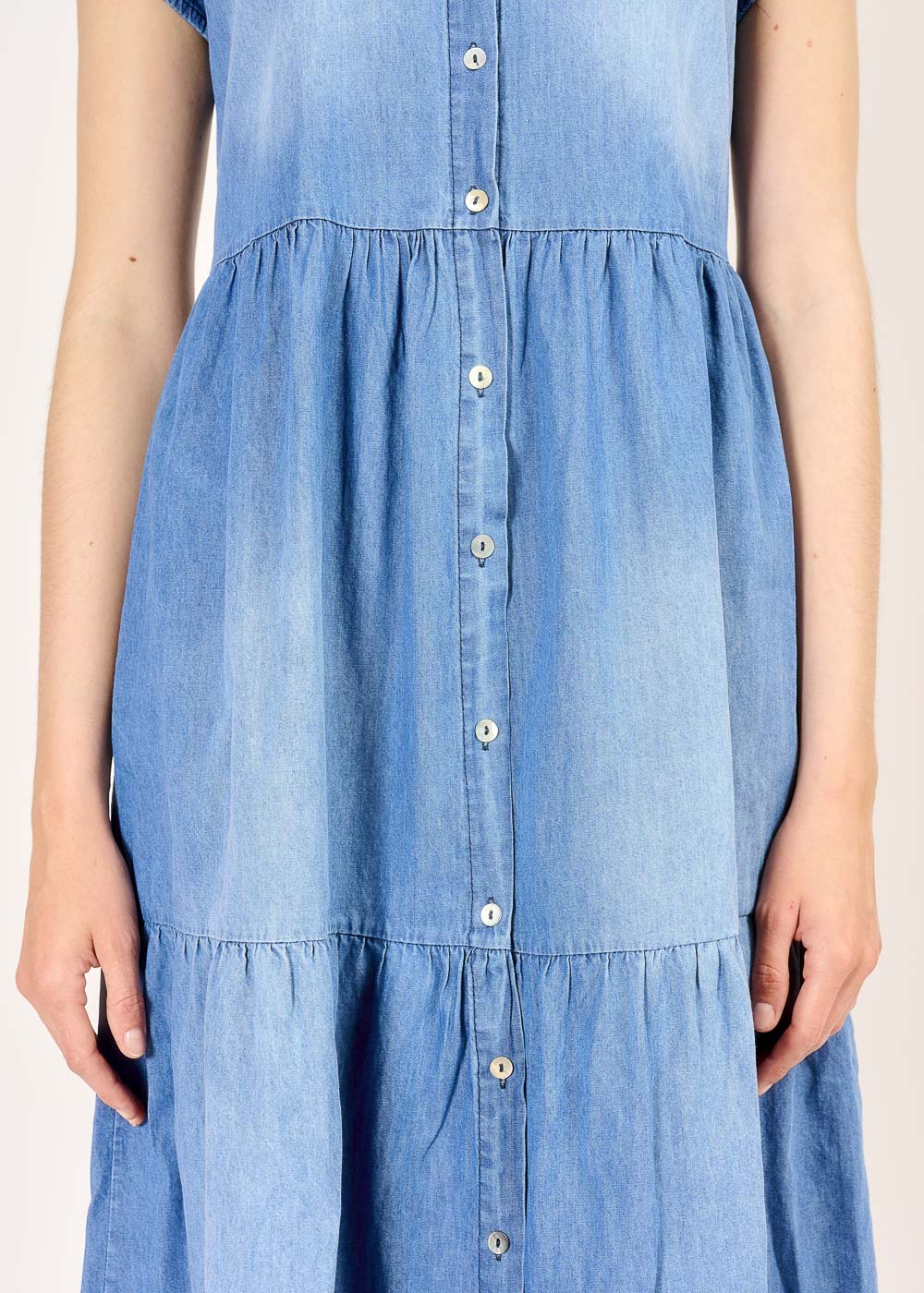 Dieses lange Jeanskleid verbindet zeitlosen Denim-Charme mit einem modernen, femininen Schnitt. Die durchgehende Knopfleiste und der Taillengürtel sorgen für eine schmeichelhafte Silhouette und vielseitige Stylingmöglichkeiten. Ob mit Sneakern oder Sandalen – dieses Kleid ist ein unkomplizierter Allrounder für jeden Tag.