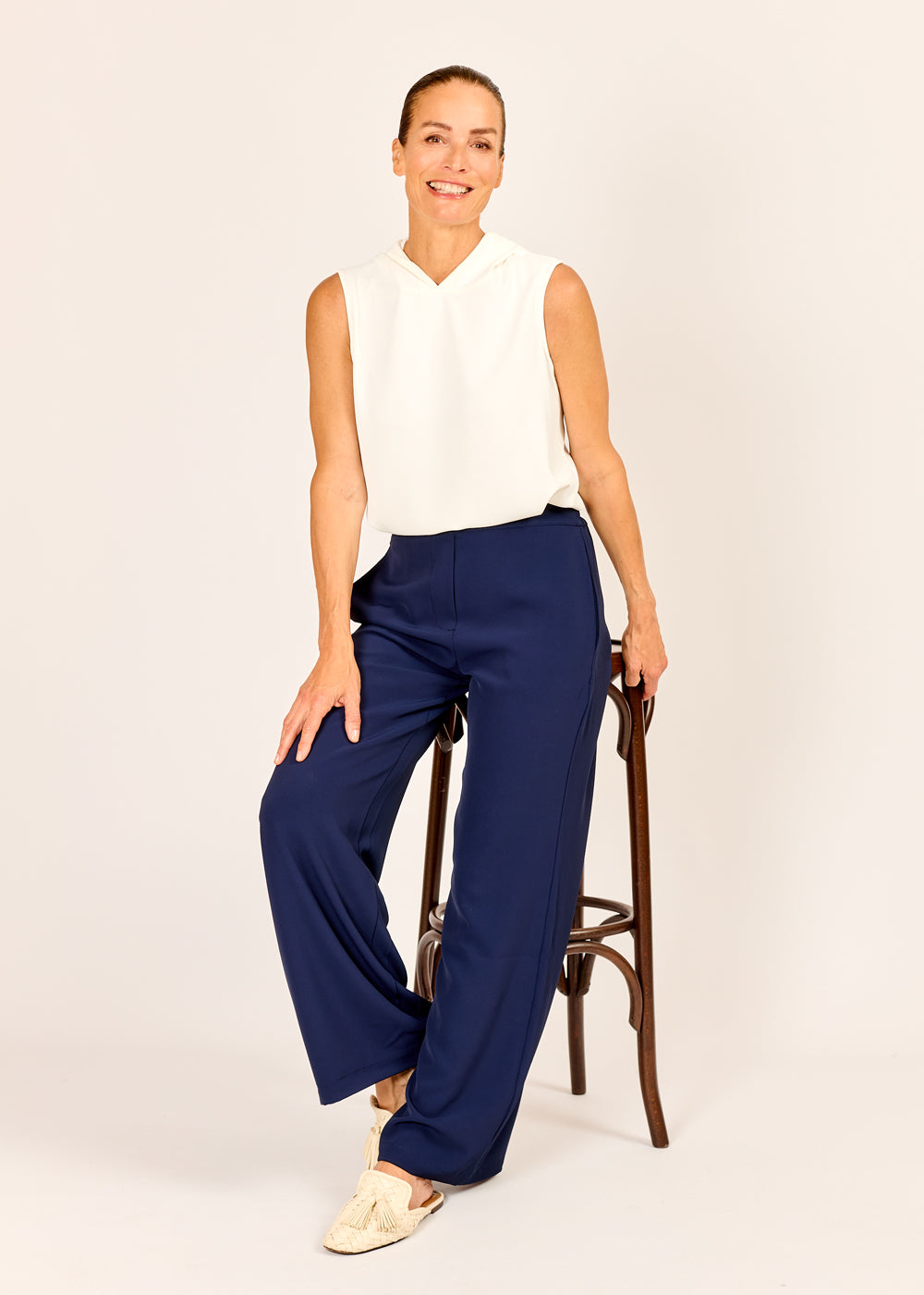Diese edle Pantalone in der Farbe Blu Scuro überzeugt mit ihrer fließenden Silhouette und einem modernen, weiten Bein. Der komfortable Bund ohne Verschluss sorgt für ein angenehmes Tragegefühl und eine cleane Optik. Ob im Büro oder elegant gestylt für den Abend – diese Hose ist ein stilvoller Allrounder mit italienischem Flair.