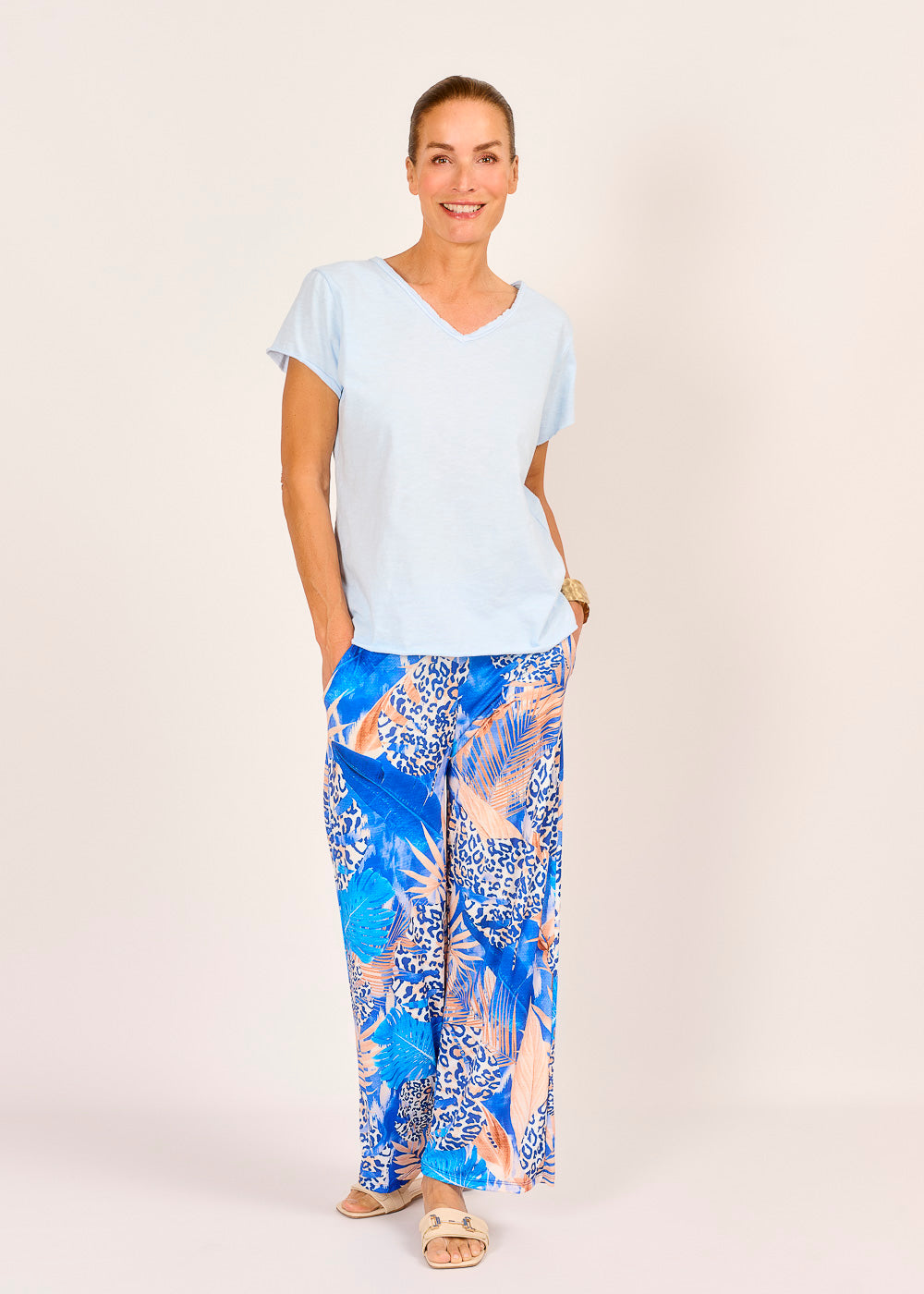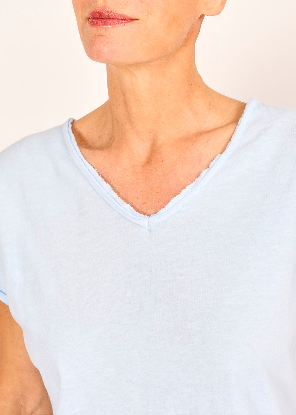 Dieses Shirt in einer zeitlosen Farbe mit kurzen Ärmeln und V-Ausschnitt gehört als vielseitiges Basic in jede Garderobe. Der schmeichelnde Ausschnitt bringt die Silhouette dezent zur Geltung, während das angenehme Material für ein rundum komfortables Tragegefühl sorgt.