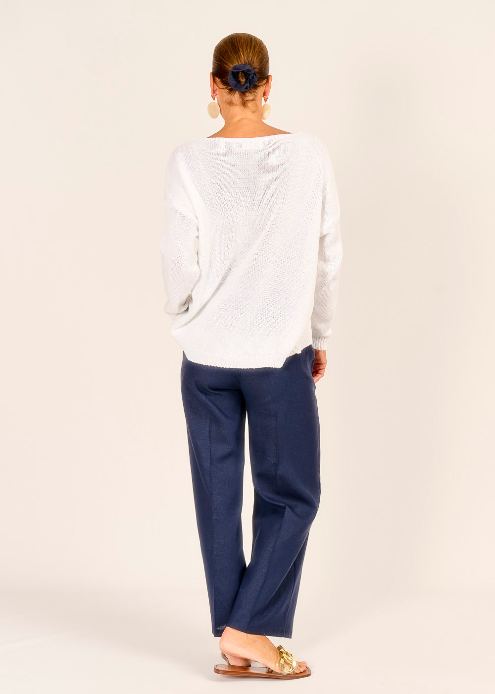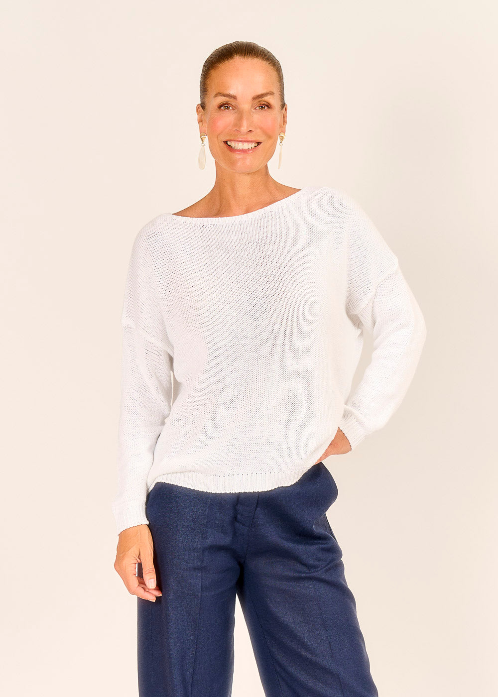 Dieser leichte Strickpullover in strahlendem Weiß ist ein zeitloses Essential, das Eleganz und Komfort vereint. Der weite, runde Saum und der U-Boot-Ausschnitt sorgen für eine entspannte Passform und eine schmeichelhafte Silhouette. Perfekt für kühle Sommerabende oder als stilvoller Layering-Partner.
