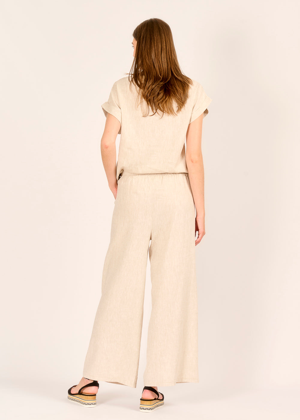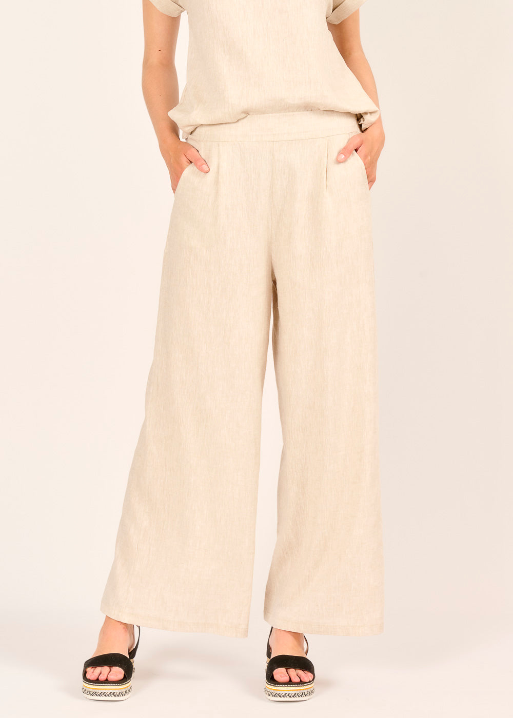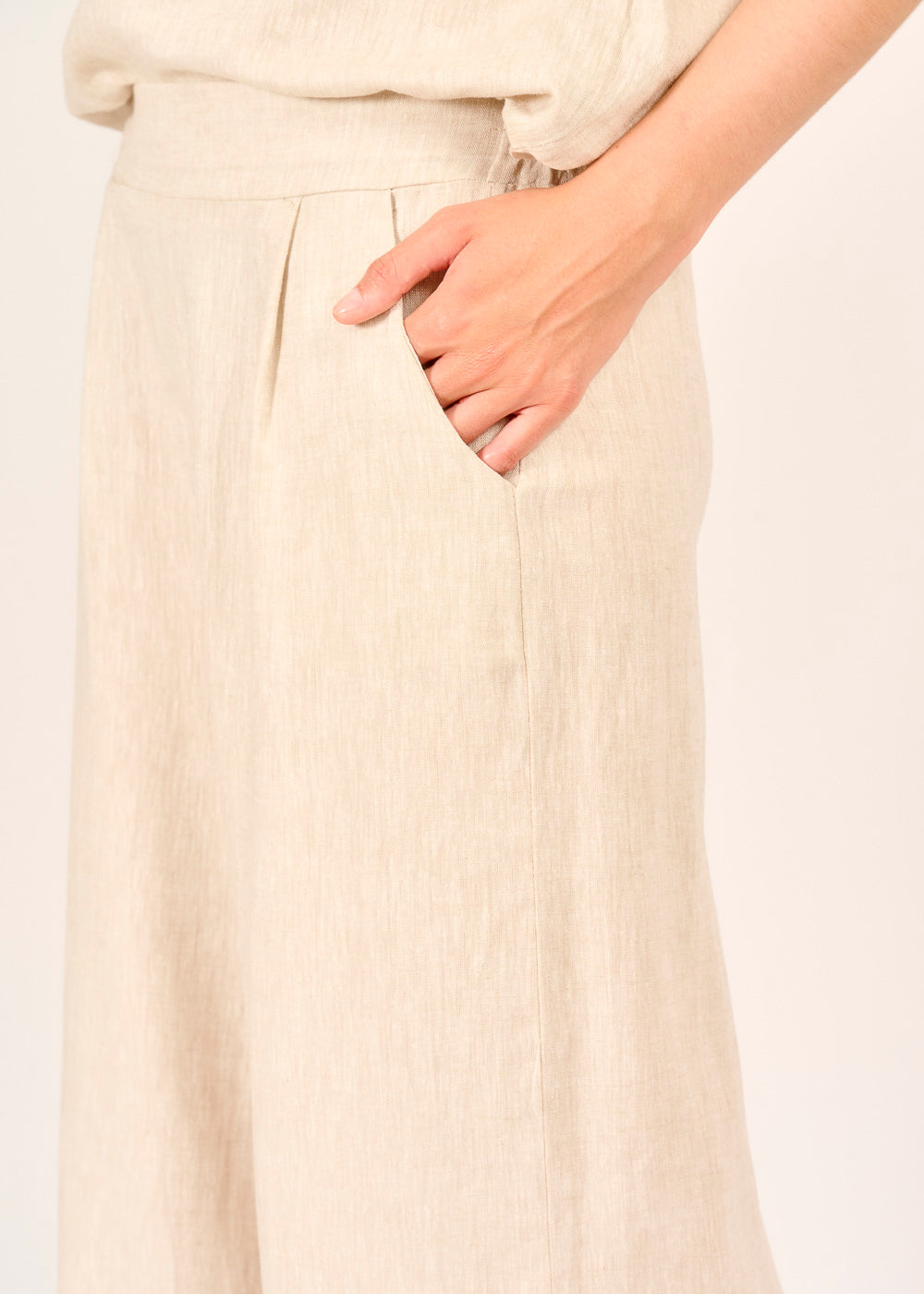 Diese elegante Leinenhose in sanftem Beige ist Ihr perfekter Begleiter für stilvolle Auftritte an warmen Tagen. Der weite, fließende Schnitt und der komfortable Bund sorgen für eine schmeichelhafte Silhouette und unbeschwerte Bewegungsfreiheit. Kombinieren Sie sie mühelos für einen entspannten Tageslook oder einen schicken Abendauftritt.