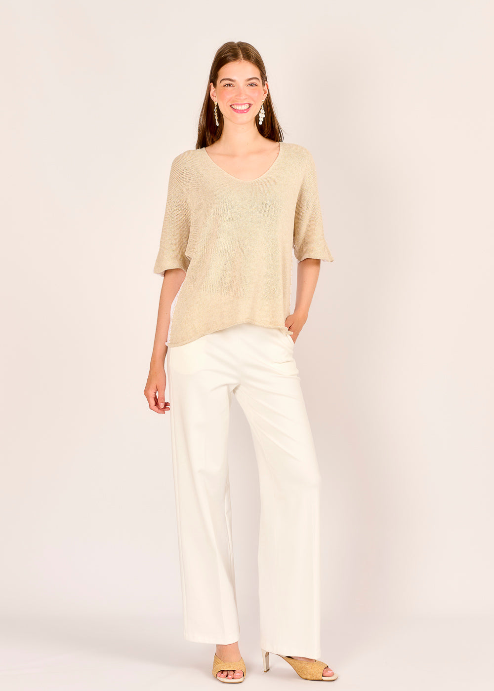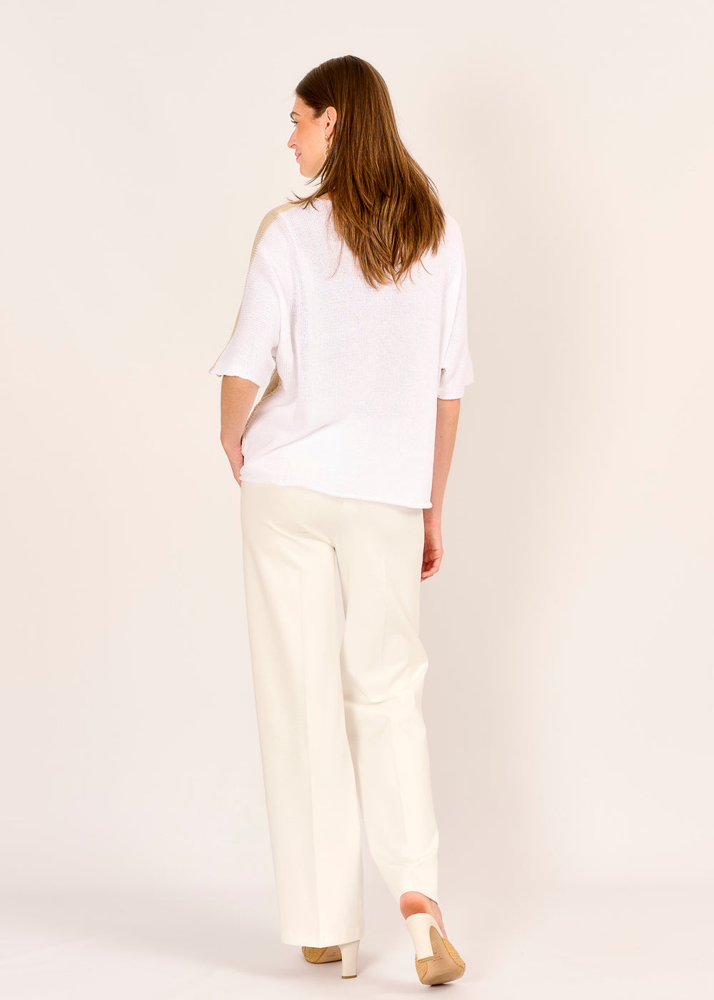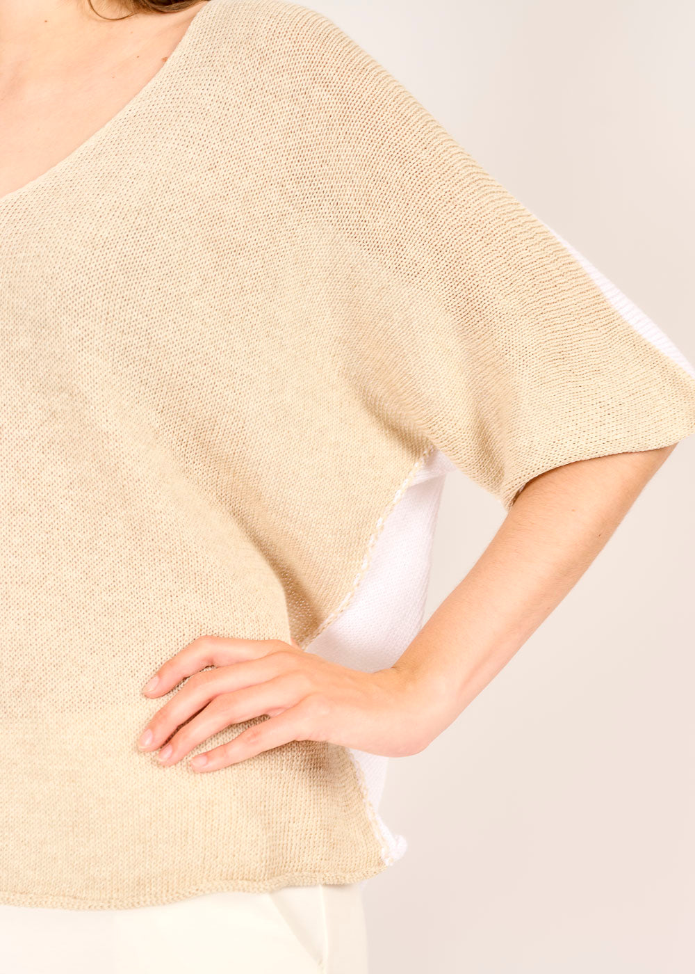 Dieser elegante zweifarbige Pullover verbindet zeitlose Eleganz mit modernem Chic: Die Vorderseite in zartem Beige strahlt natürliche Wärme aus, während die reine weiße Rückseite einen frischen, luftigen Kontrast bildet. Perfekt für einen mühelos stilvollen Look, der sich sowohl tagsüber als auch abends tragen lässt. Fühlen Sie sich wohl in diesem einzigartigen Design, das Ihre Garderobe gekonnt aufwertet.