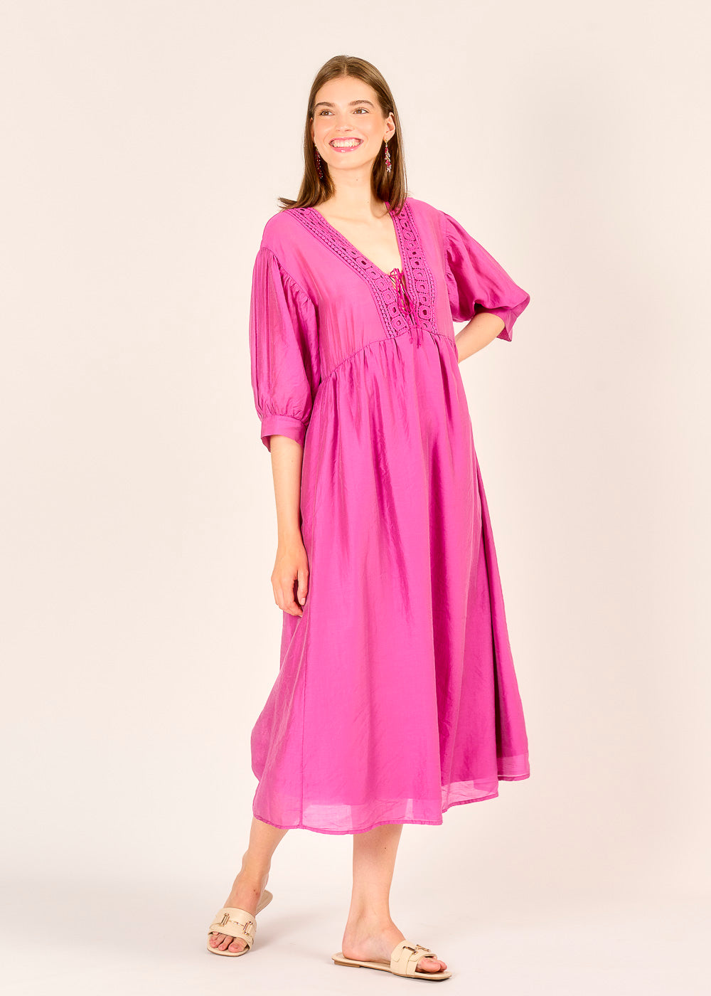 Luftig, lässig, unwiderstehlich – dieses Sommerkleid in leuchtendem Fuchsia bringt Boho-Vibes in Reinform in deinen Kleiderschrank. Der weite Schnitt aus weichem Lyocell umspielt deine Silhouette wie eine Sommerbrise und sorgt für maximalen Komfort an heißen Tagen. Ein echtes Fashion-Highlight für alle, die das Besondere lieben – unkompliziert, feminin und voller Lebensfreude.