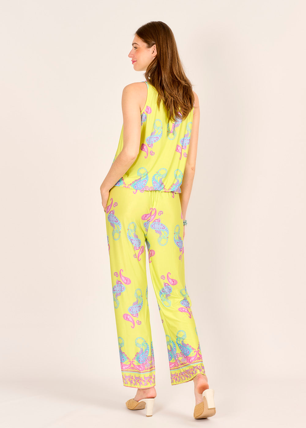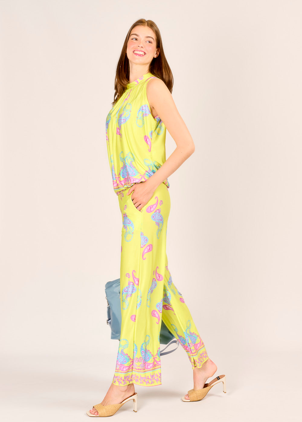 Diese Hose in strahlendem Limettengrün ist ein echter Gute-Laune-Garant und zieht mit ihrem lebhaften Paisley-Muster alle Blicke auf sich. Gefertigt aus 100% knitterarmer PES Kofferware, ist sie der ideale Begleiter für unterwegs und bietet stets einen gepflegten Look ohne Aufwand. Kombinieren Sie sie für einen frischen, modernen Stil, der Komfort und auffälliges Design perfekt vereint.