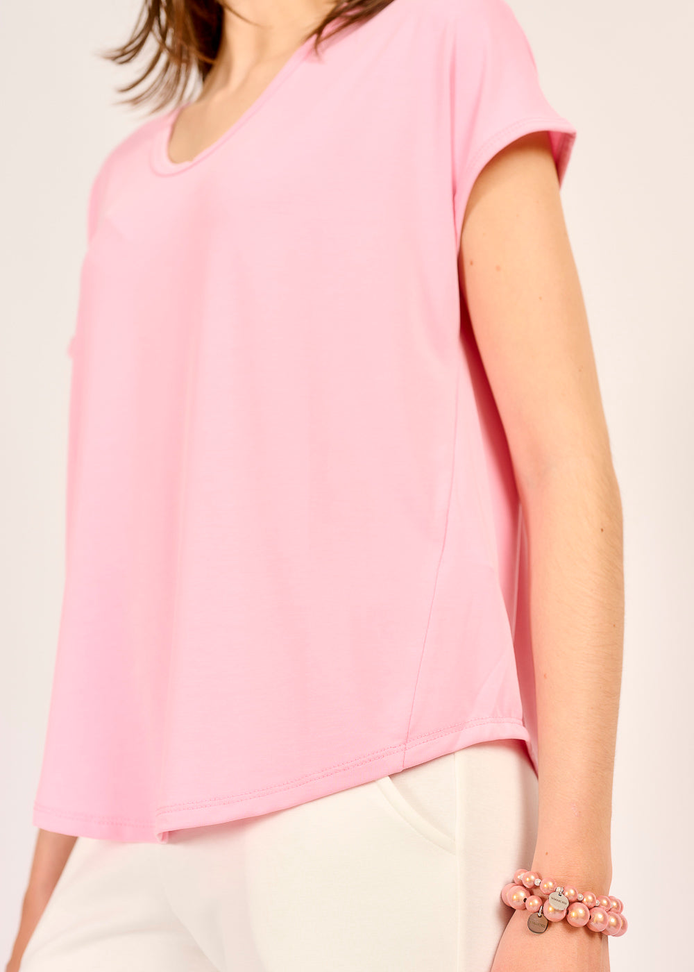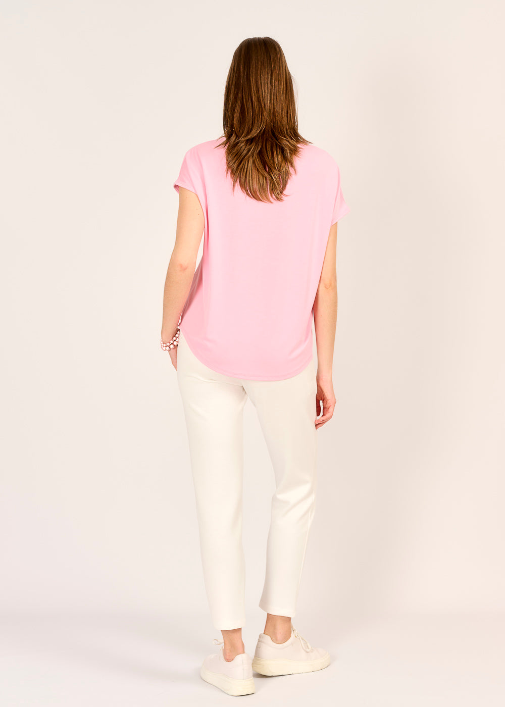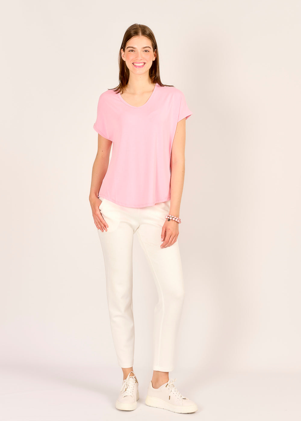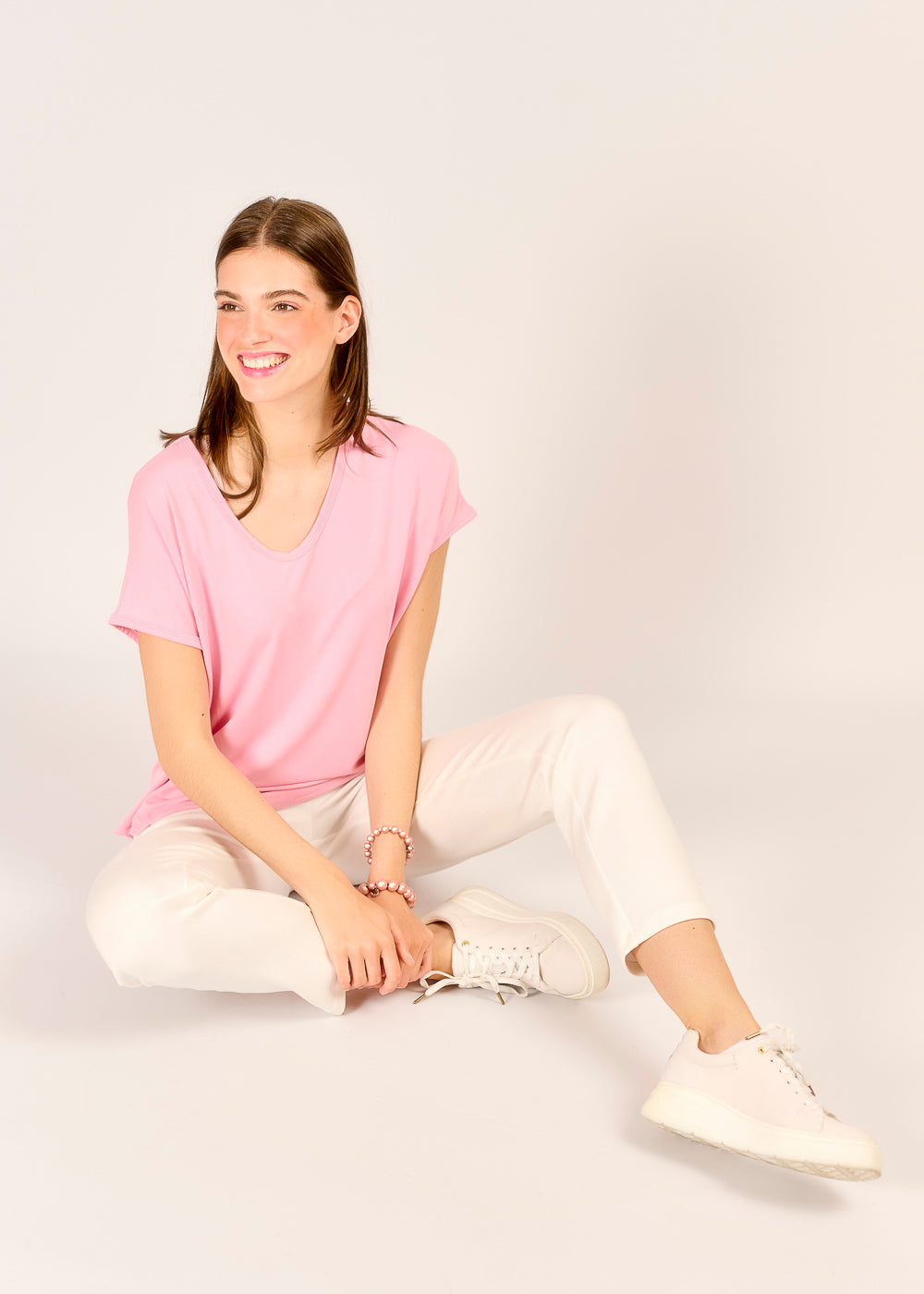 Dieses elegante V-Viskoseshirt in zartem Rosa ist die perfekte Ergänzung für Ihre Sommergarderobe. Die feine Viskosequalität sorgt für ein unglaublich weiches Gefühl auf der Haut und fällt wunderbar fließend. Mit seinem klassischen V-Ausschnitt und der entspannten Passform lässt es sich vielseitig kombinieren und ist ideal für sowohl legere als auch schickere Anlässe.