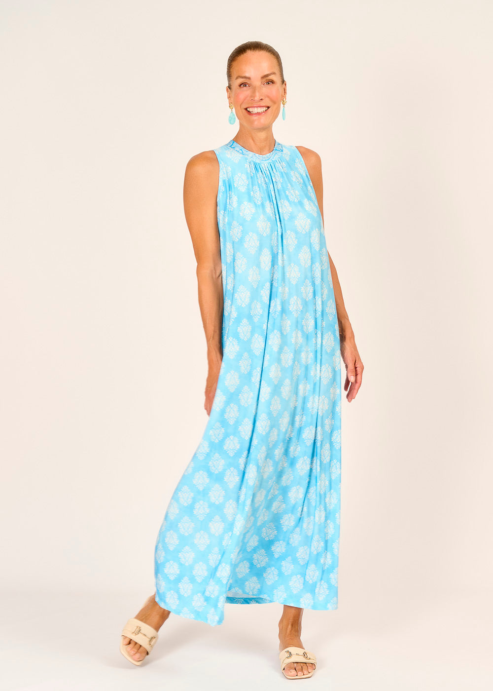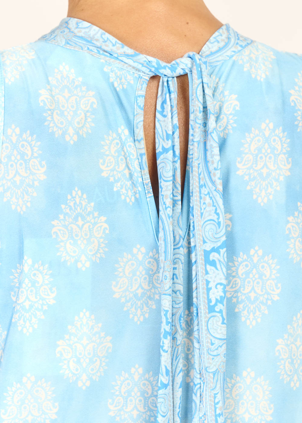 Dieses fließende Maxikleid in leuchtendem Hellblau mit zartem Paisley-Muster ist der Inbegriff sommerlicher Eleganz. Gefertigt aus knitterarmer 100% PES Kofferware, ist es der perfekte Begleiter für Reisen und warme Tage, ohne dass Sie sich um Bügeln sorgen müssen. Der Neckholder-Ausschnitt mit raffiniertem Bindedetail im Rücken verleiht dem Kleid eine feminine Note und macht es zu einem echten Blickfang.