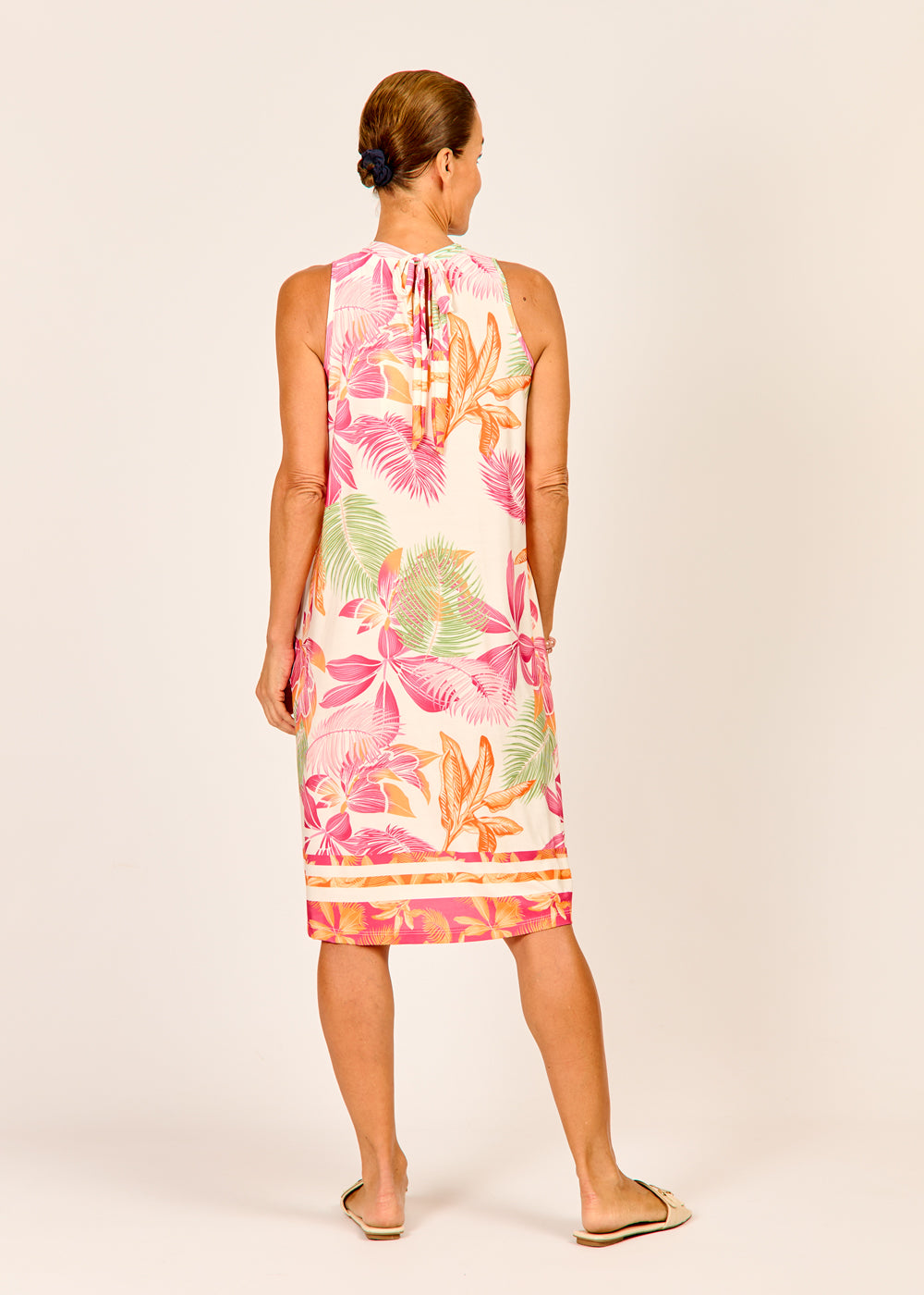 Entdecken Sie das perfekte Sommerkleid: Dieses kurz geschnittene Neckholderkleid mit seinen tropischen Blattmustern in Pink, Orange und Grün fängt die Leichtigkeit warmer Tage ein. Der elegante Neckholder-Schnitt betont die Schultern, während der lockere Fall des Kleides unbeschwerte Bewegungsfreiheit verspricht. Ideal für Strandtage, Gartenpartys oder einfach, um sommerliche Lebensfreude auszustrahlen.