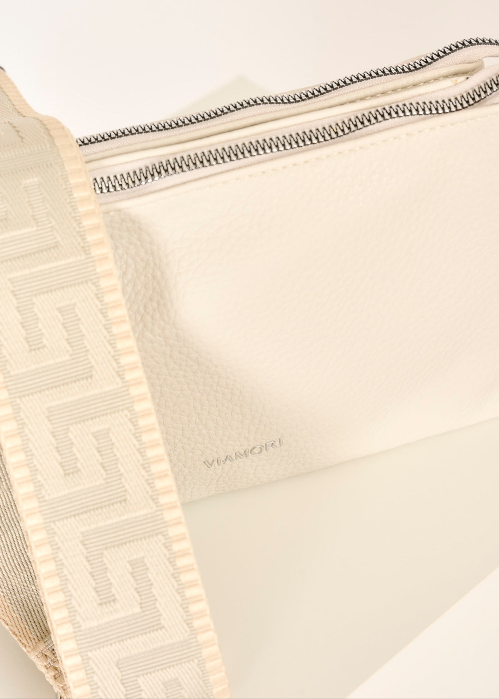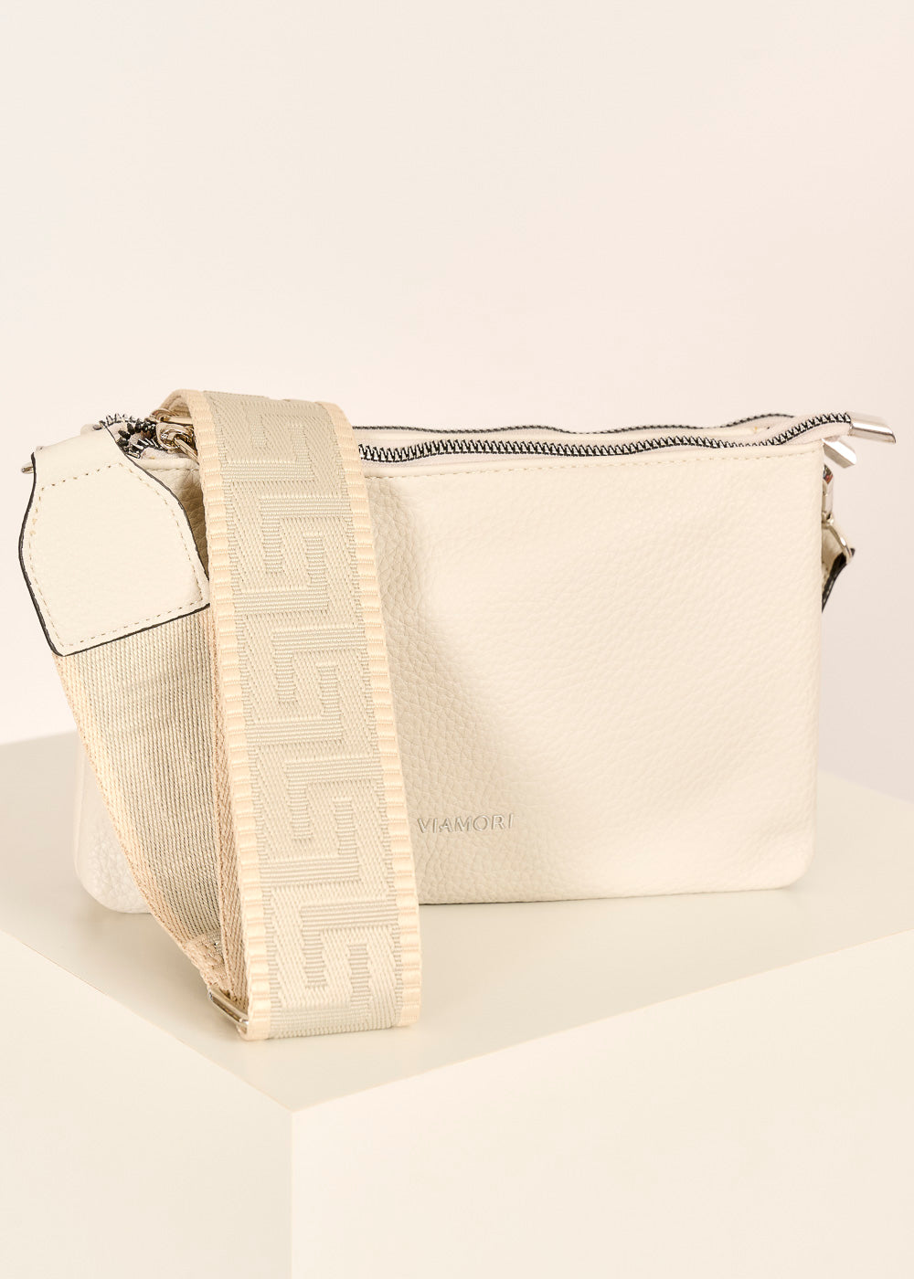 Entdecken Sie die "Borsa Citta" – eine stilvolle Umhängetasche in elegantem Creme, die urbanen Chic mit praktischem Design verbindet. Das genarbte Material und der auffällige Reißverschluss verleihen ihr eine moderne Note, während der breite, gemusterte Trageriemen für optimalen Komfort sorgt. Perfekt für den täglichen Gebrauch, bietet sie ausreichend Platz für Ihre Essentials und rundet jedes Outfit gekonnt ab.