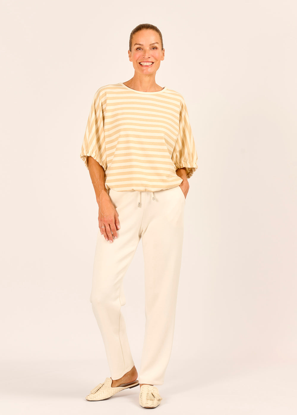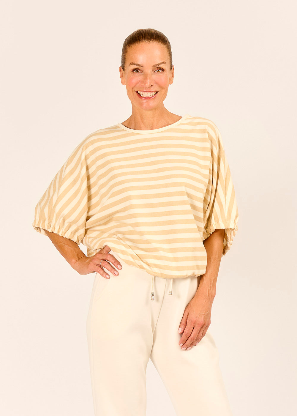 Dieser charmante Ringelsweat vereint maritimes Flair mit entspanntem Komfort und ist ein echter Blickfang für Ihre Garderobe. Die weiten Ärmel mit dem raffinierten Bund verleihen ihm eine moderne Silhouette, die mühelos Stil und Gemütlichkeit verbindet. Perfekt zu lässigen Hosen oder Jeans, ist dieses Oberteil ideal für einen entspannten Tag, an dem Sie trotzdem chic aussehen möchten.