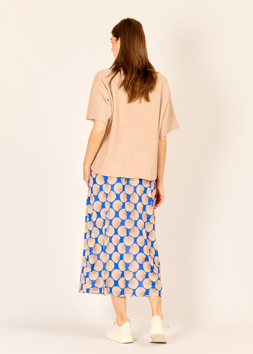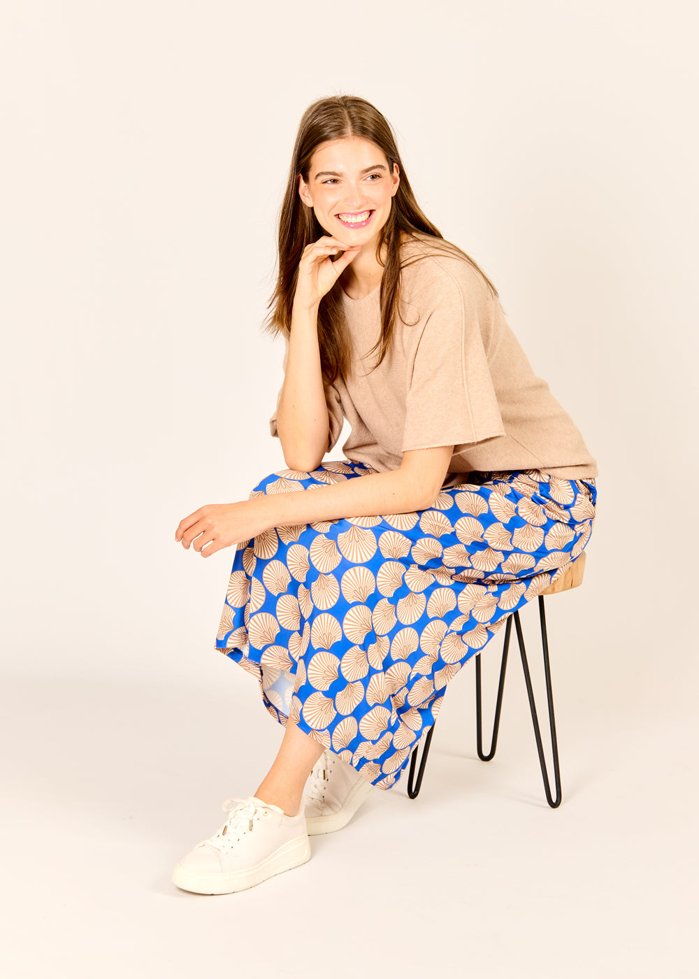 Dieser Rock mit seinem verspielten Muschelmuster in zartem Beige auf leuchtend blauem Hintergrund versprüht pure Sommerlaune. Aus 100% PES in hochwertiger Kofferware gefertigt, bleibt er selbst nach langen Reisen knitterfrei und jederzeit tragbereit. Ein leicht schwingendes Statement-Piece, das Komfort, Pflegeleichtigkeit und maritimen Chic perfekt vereint.