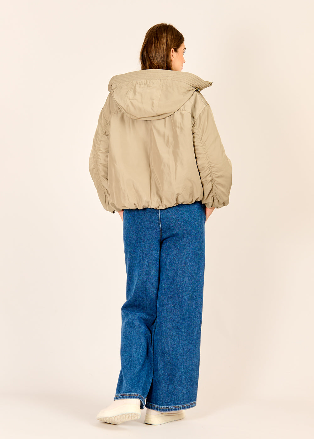 Mit ihrem leicht verkürzten Schnitt und den raffinierten Raffungen am Saum bringt diese Kurzjacke modische Frische in deinen Look. Das winddichte und wasserabweisende Material hält dich zuverlässig bei jedem Wetter geschützt. Eine leichte, vegane Wattierung schenkt angenehme Wärme, ohne das Outfit zu beschweren. Für zusätzliche Bewegungsfreiheit und Komfort sorgt der praktische Zweiwege-Reißverschluss.