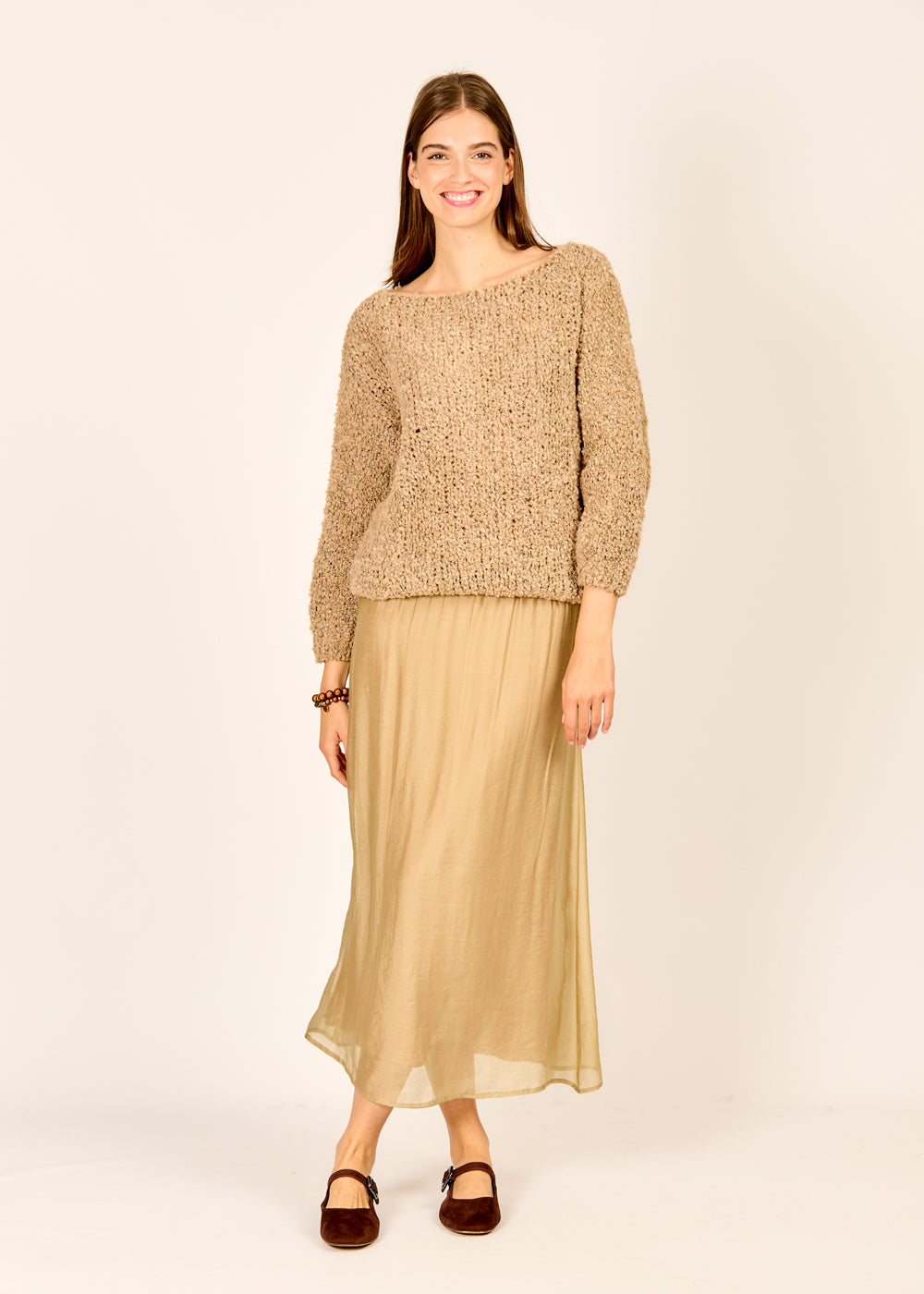 Der Bouclé-Pullover in warmem cappuccino bringt stilvolle Leichtigkeit und einen Hauch von Eleganz in den Alltag. Die markante Struktur des Bouclé-Stricks macht ihn zu einem besonderen Eyecatcher mit gemütlichem Charme. Dank seines entspannten Schnitts überzeugt er mit hohem Tragekomfort und moderner Lässigkeit. Ob zu Jeans oder Rock – dieser Pullover ist ein vielseitiger Begleiter für trendbewusste Looks.