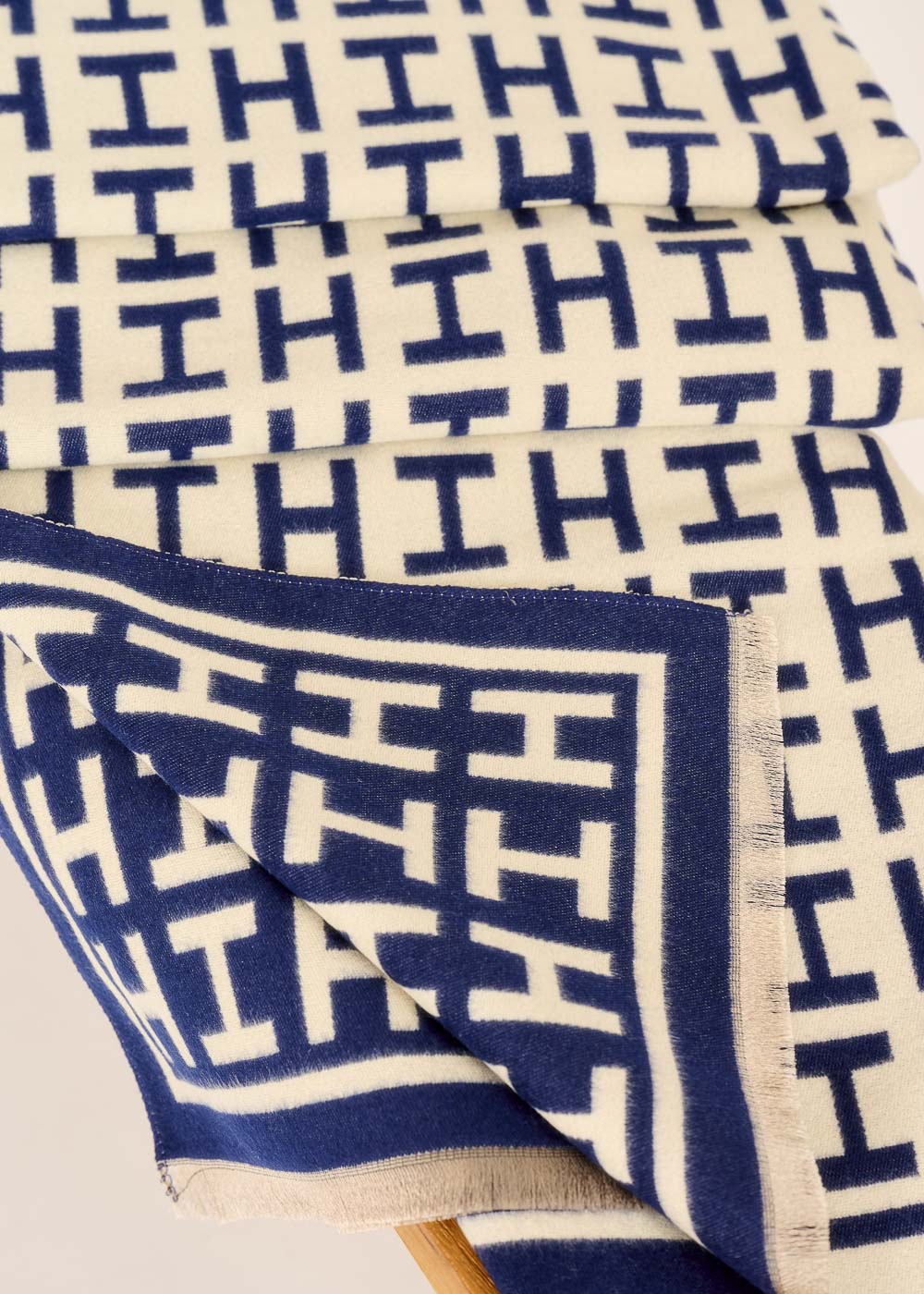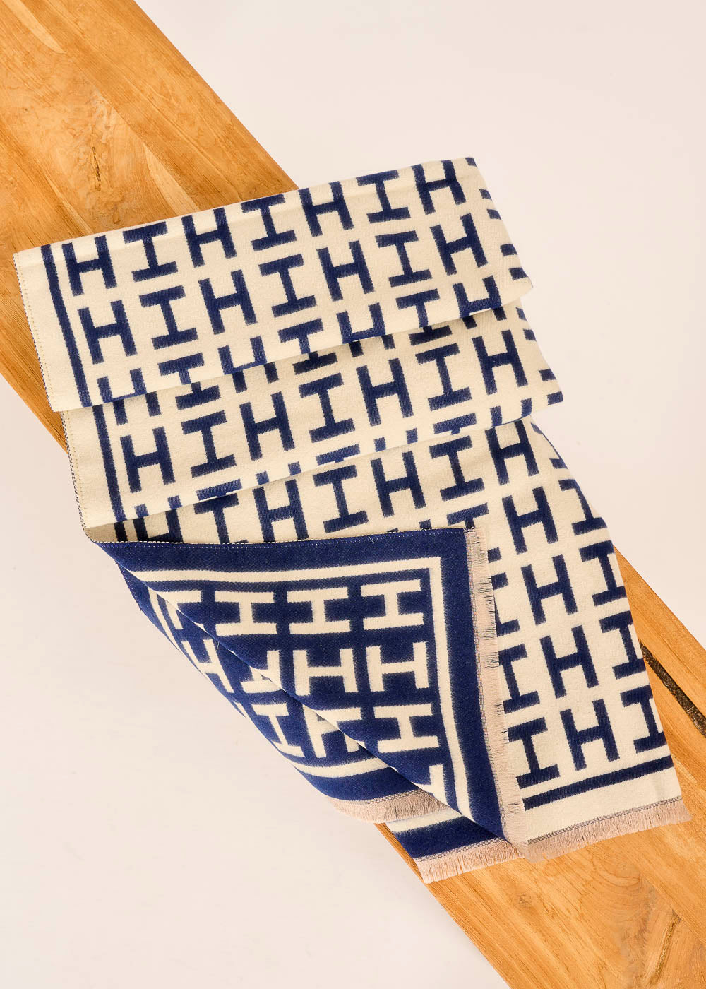 Umfange dich mit Luxus und Stil mit diesem eleganten Schal. Das markante grafische Muster in Marineblau und Creme verleiht jedem Outfit eine moderne Note. Aus einem weichen, hochwertigen Material gefertigt, bietet er nicht nur Wärme, sondern auch ein luxuriöses Gefühl auf der Haut.